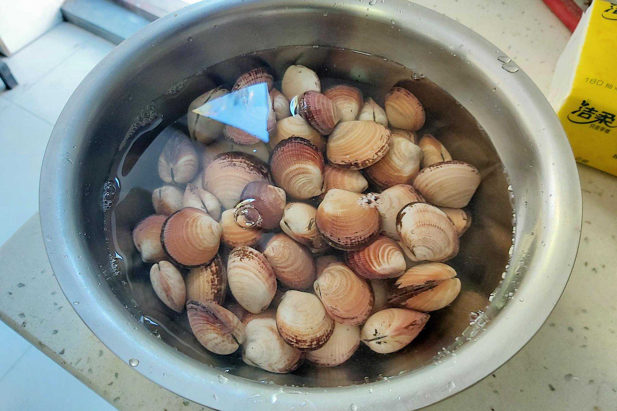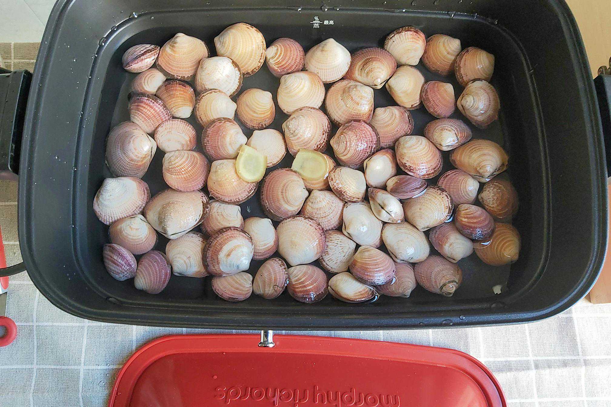 2.准备深煮锅,把清洗好的蛤蜊放入锅内,添水没过蛤蜊,撒上1勺盐,再放入姜片。