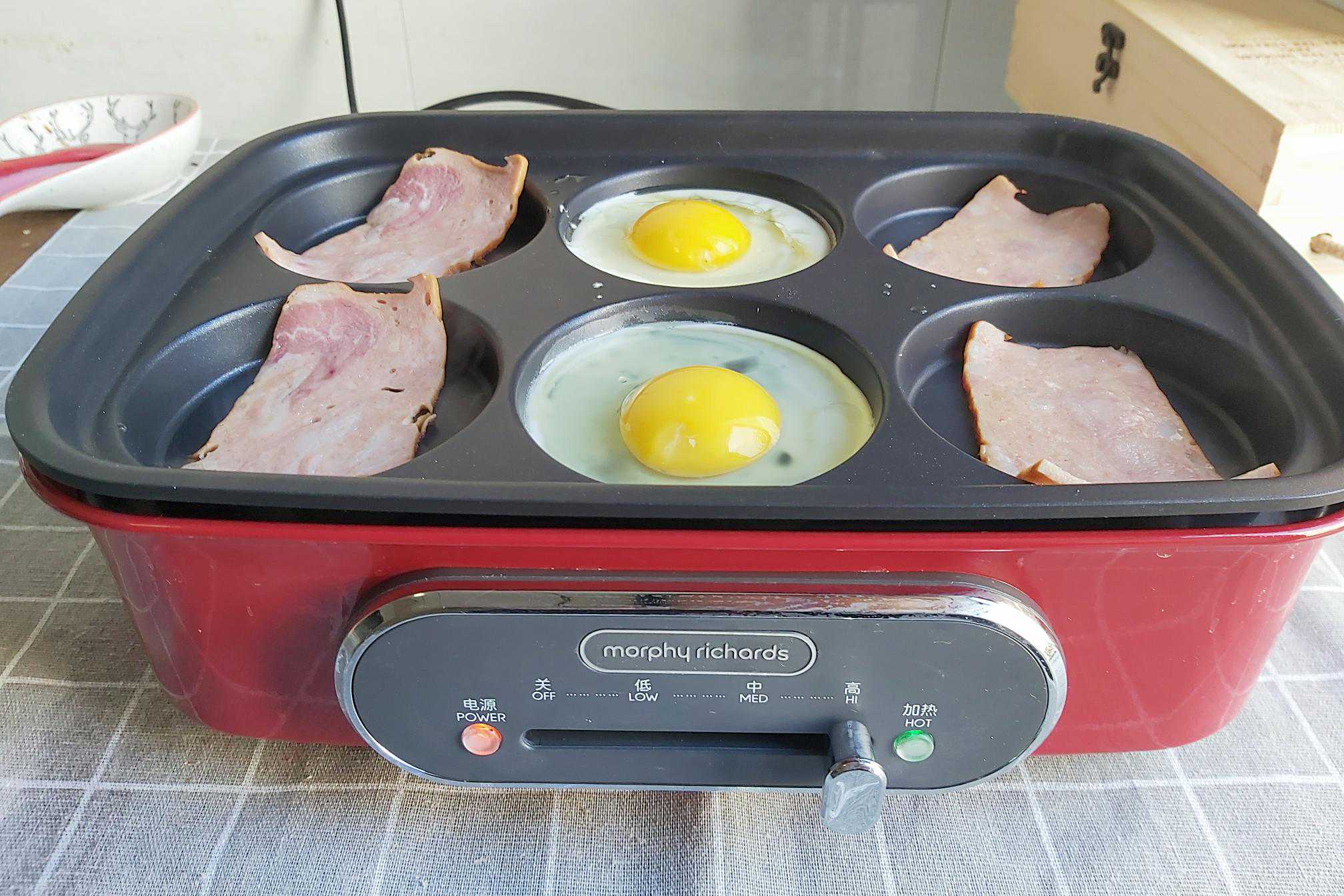5.再换成六圆盘,把培根煎一下,把油脂煎出来,再煎两个鸡蛋。