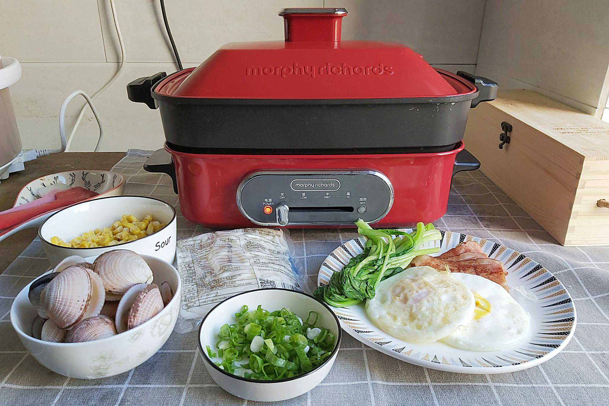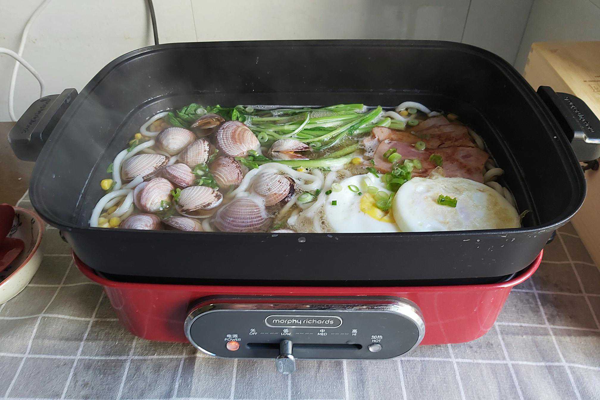 9.最后把准备好的蛤蜊、煎蛋、培根、青菜一并放入锅内。(蛤蜊根据自己喜好添加,一般一小碗即可)