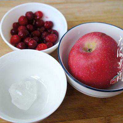 1、准备食材,苹果1个,鲜冻蔓越莓反复清洗干净,冰糖根据自己喜欢的口感添加。苹果是很多女性朋友美容减肥必选的水果之一,丰富的果胶有助调节肠蠕动,排毒养颜。尤其富含的维生素C还能美白皮肤,常吃苹果,有助消除皮肤雀斑、黑斑,保持皮肤细嫩红润。
