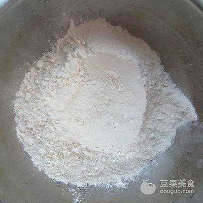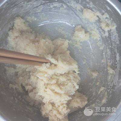 4、一边冲入开水,一边用筷子搅拌成没有面粉颗粒的面团。