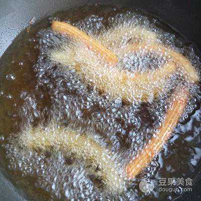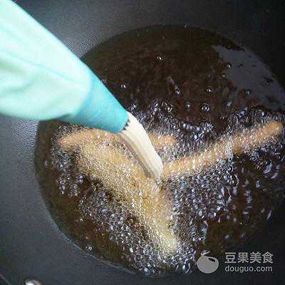 7、锅里放适量植物油,烧热后挤入面糊,长度可以自己掌握。