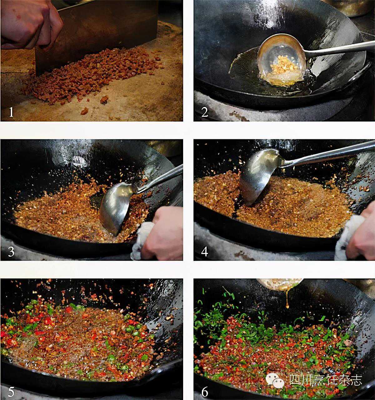 2.锅置旺火上,下五花肉条煸炒成油渣,捞起来沥油,置案板上剁成粗粒。