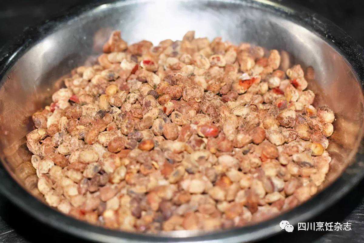 说明:水豆豉在各个地方的用法都有一些差别,即使在宜宾地区也有两种主要做法,一种是把黄豆煮熟了再发酵,另一种是把黄豆在锅里炒至半煳时,再加水煮熟,然后再进行发酵。黄豆发酵后,还要加入一定量的盐、剁椒和子姜粒,拌匀后再放坛子里存放。相比之下,宜宾水豆豉的风味似乎更为浓郁。