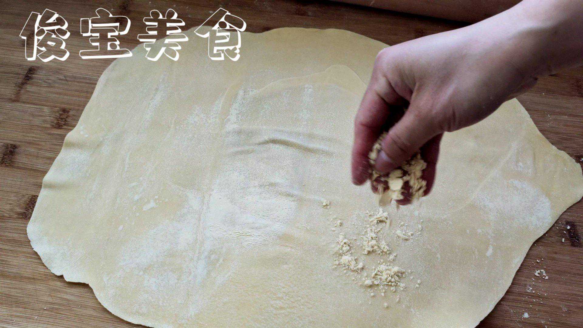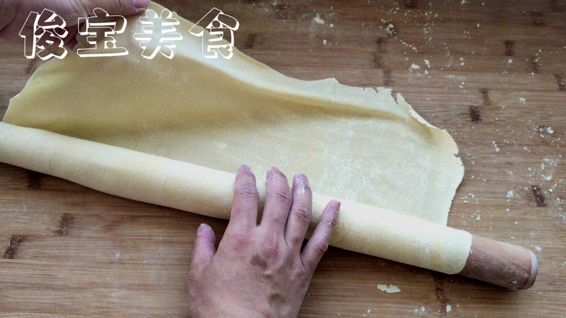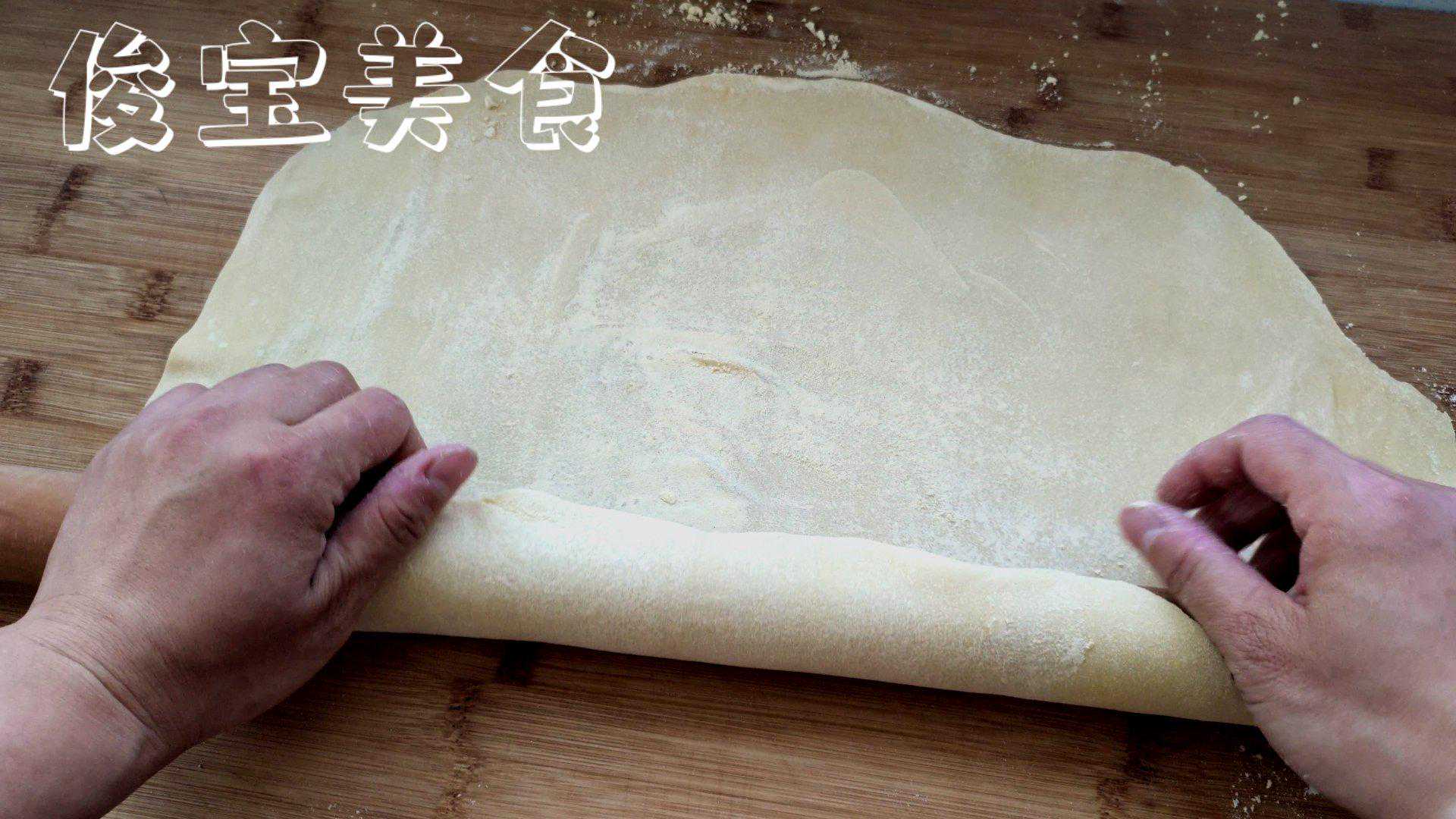 ⑤然后把擀薄的面片展开,补充手粉,再换一个方向,用擀面杖滚起来,继续擀。如此反复,直到薄厚满意为止。