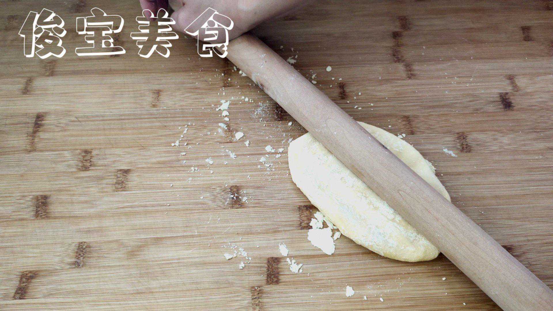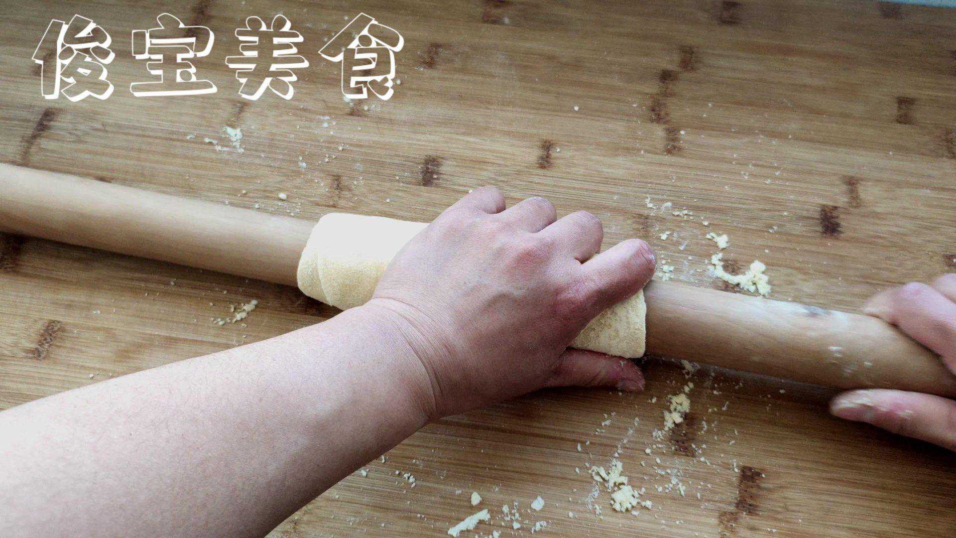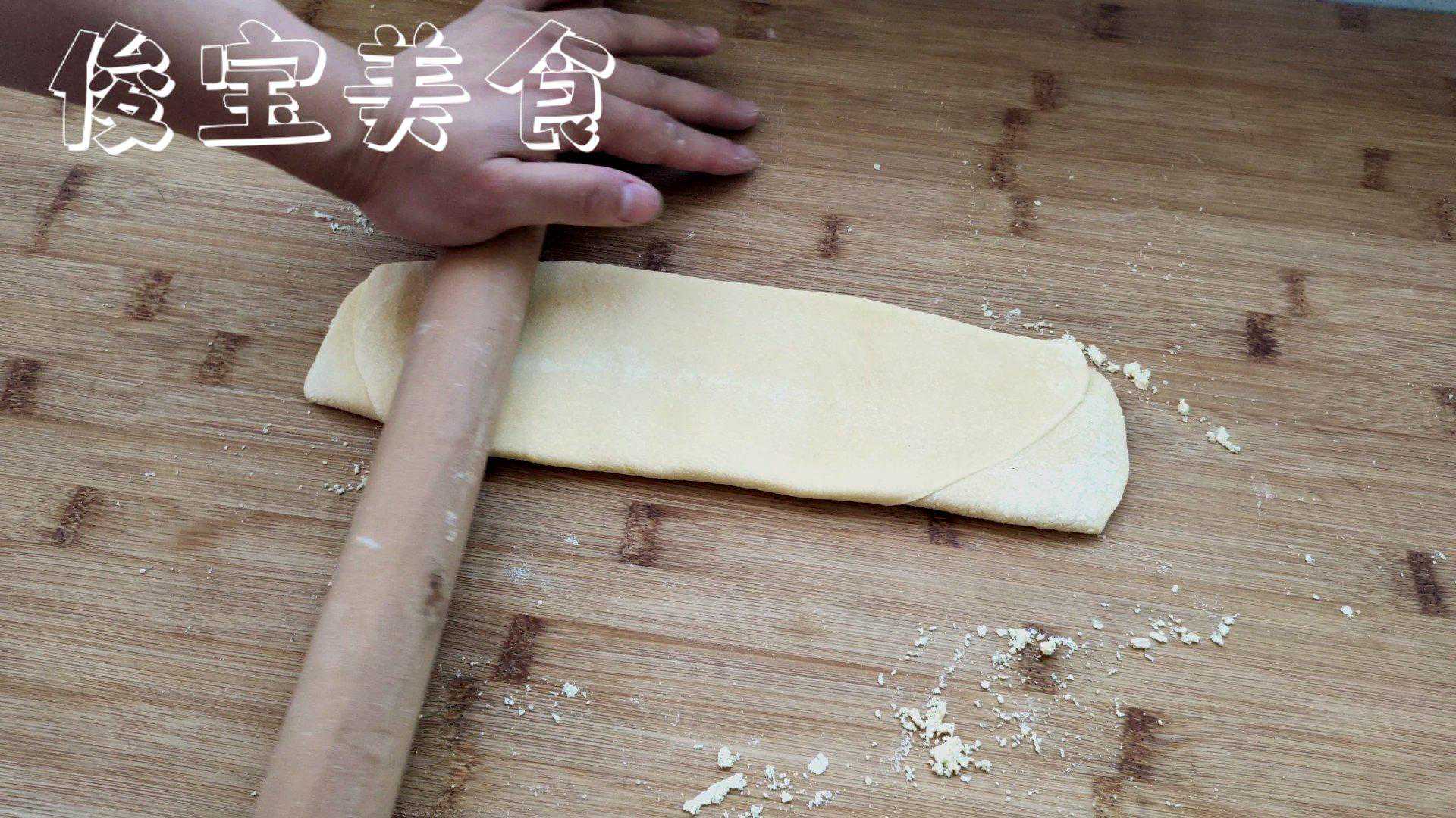 ⑤然后把擀薄的面片展开,补充手粉,再换一个方向,用擀面杖滚起来,继续擀。如此反复,直到薄厚满意为止。