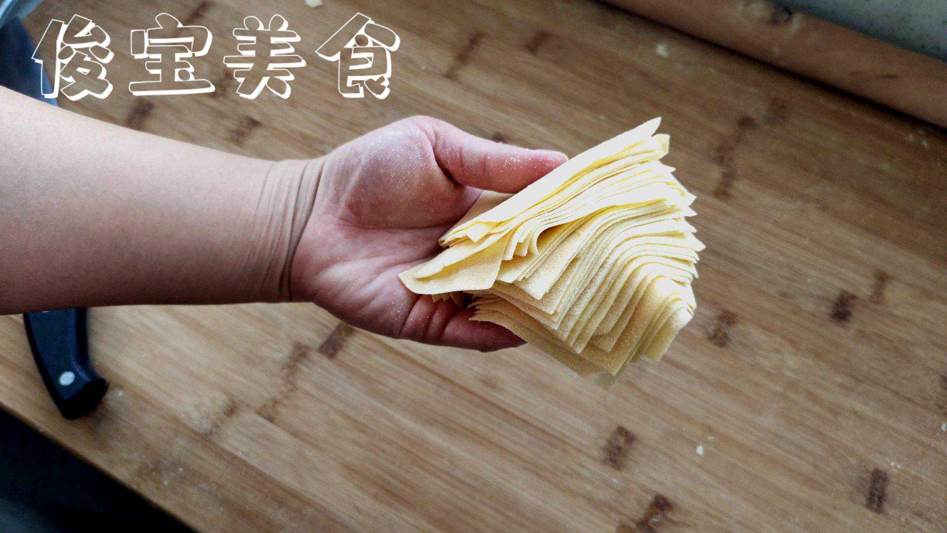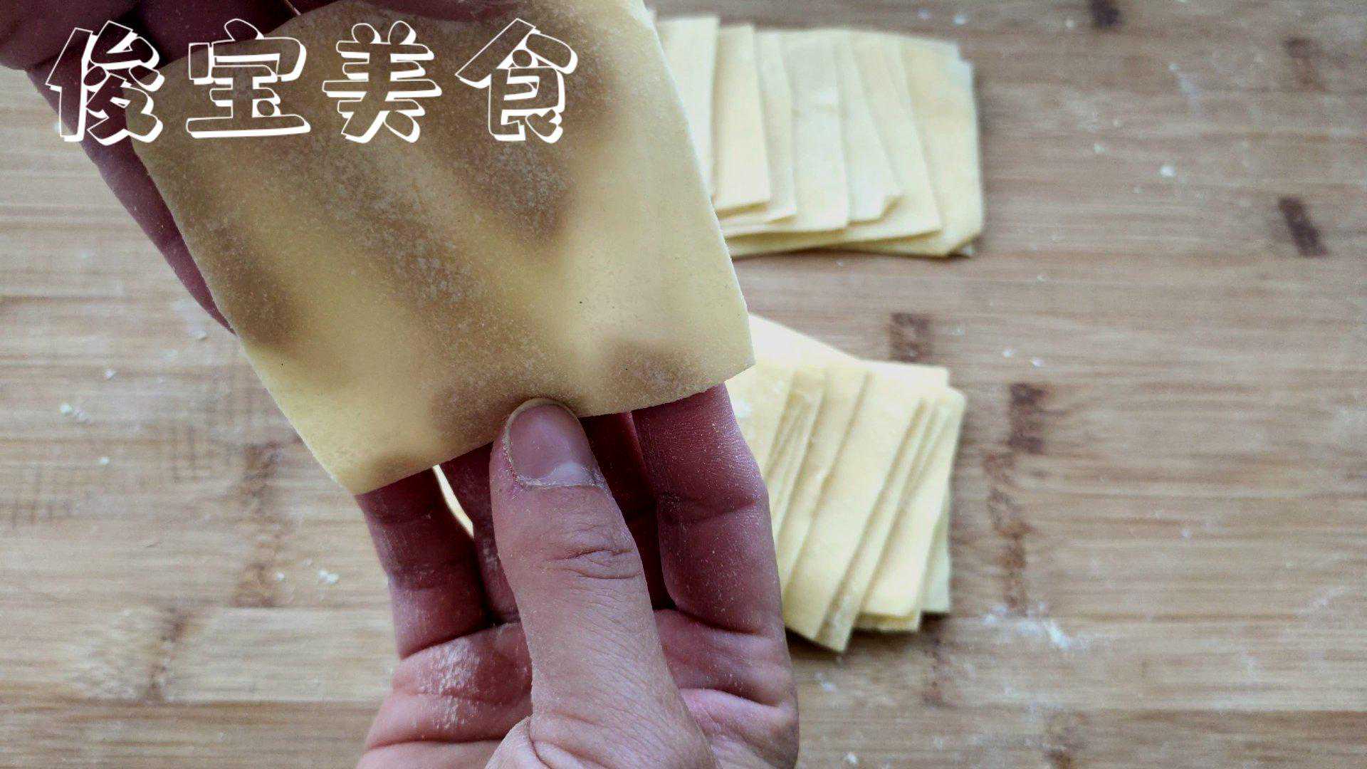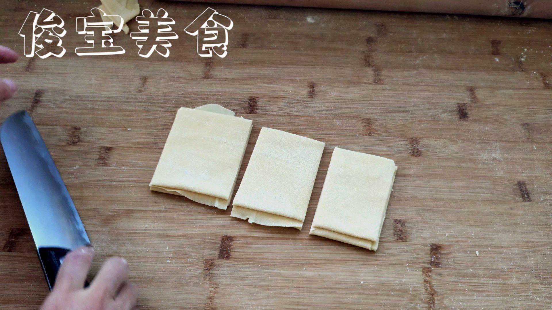 ⑥把面片像叠扇子那样叠起来,边缘不规则的地方切掉。然后先切成宽条状,再把所有的宽条摊开,重叠起来,切成和平时买的馄饨皮差不多大小的正方形就可以了。第一刀切好的里面,留下一张当样本,后面的都照着样本来切,这样所有的馄饨皮大小就是一致的。
