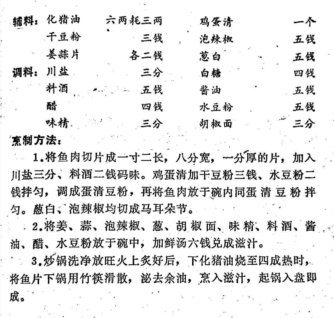 调料:川盐三分;料酒五钱;醋四钱;味精三分;白糖四钱;酱油五钱;水豆粉五钱;胡椒面三分。