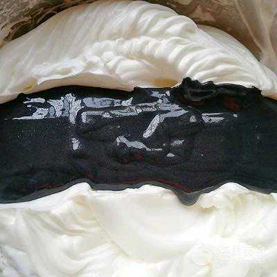 4、筛入混合好的竹炭粉和低筋面粉,用手动打蛋器呈“Z”字形来回搅动,切记不要转圈搅拌,以免起筋。
