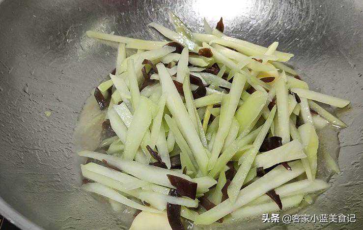 这次的佛手瓜不准备焖肉,当然也不用切厚块,先切成片,再细条;买了点比较大片的炸油豆腐干,切成两半叠起来,再切成细条;把泡发洗净的脆口木耳也折叠一下,再切成细条,备用。