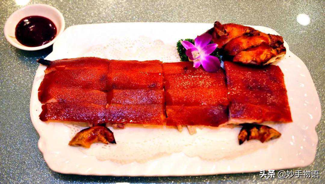 北京烤鸭第一种吃法:据说是由大宅门里的太太小姐们兴起的。她们既不吃葱,也不吃蒜,却喜欢将那又酥又脆的鸭皮蘸了细细的白糖来吃。此后,全聚德的跑堂一见到女客来了,便必然跟着烤鸭,上一小碟白糖。