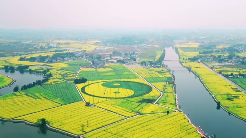 潼南油菜花景区在崇龛镇青岗村种植以油菜为主要背景、小麦为配景,直径达236米的中国大油菜花太极图案;