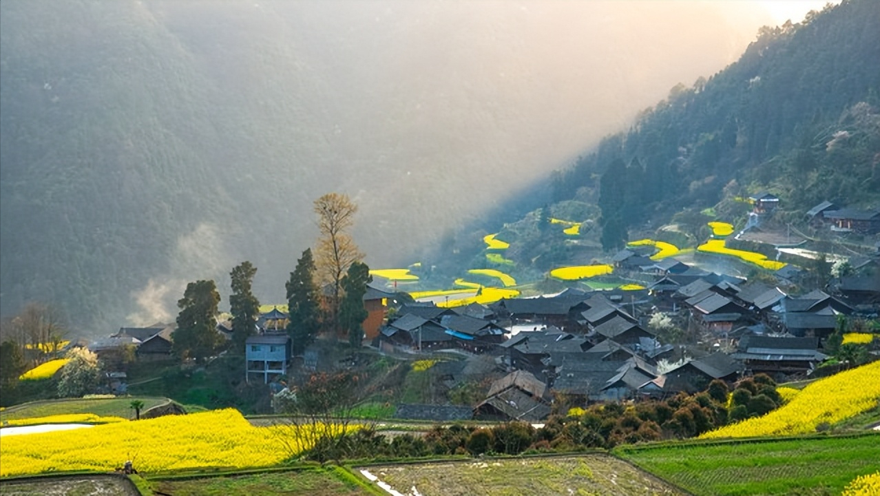 尤其是山顶人家成了江岭风光的大背景,远眺白墙黛瓦掩在黄花绿树间,阵阵云雾飘来,恍若天上人间,被誉为中国春季“四大花海”之一。