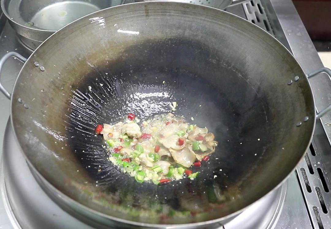 3.锅内再次烧油,油热以后倒入葱姜蒜片、小米椒炒出香味,倒入包菜丝用大火快速翻炒,翻炒2分钟左右,翻炒至包菜丝断生倒入粉丝,淋入一点明油继续翻炒。