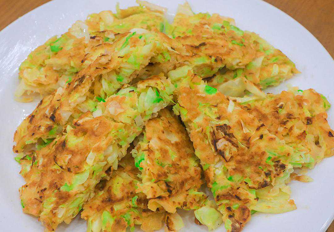 4.在饼的周围均匀淋上植物油,防止烙糊,盖上锅盖再烙三分钟,保留饼内部的水分,饼两面都呈金黄色时即可出锅,把包菜饼切成均匀小块即可,这道外酥里软的香煎包菜就做好了。