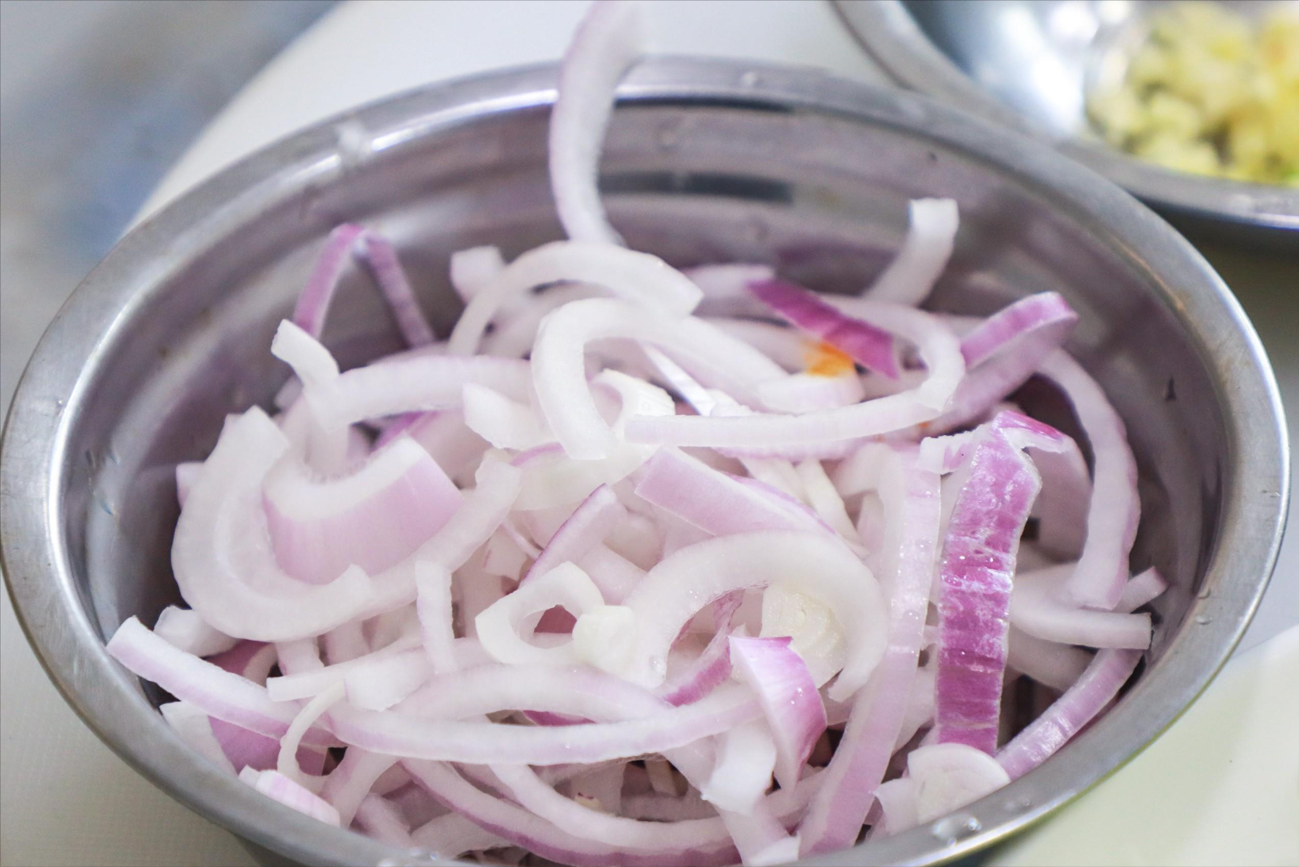 1.准备洗净的包菜半个,把根茎去除切成宽条,洋葱半个切成片放入清水中,多抓洗一会儿,去除洋葱的辛辣味。