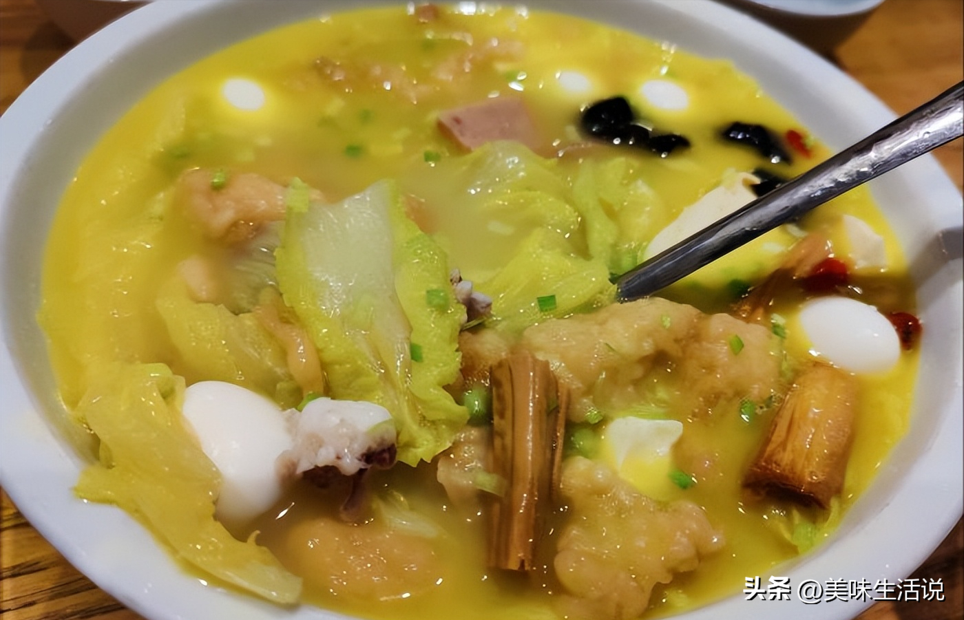 食材非常丰富的一道菜,味道好!汤汁浓郁,白菜鲜美软嫩,炸鱼肉,炸小肉,扇贝肉,火腿,炸虾仁,午餐肉、鹌鹑蛋等,一锅烩出来,又各自保留自己的味道,互不干扰,又相得益彰,好吃必须推荐!