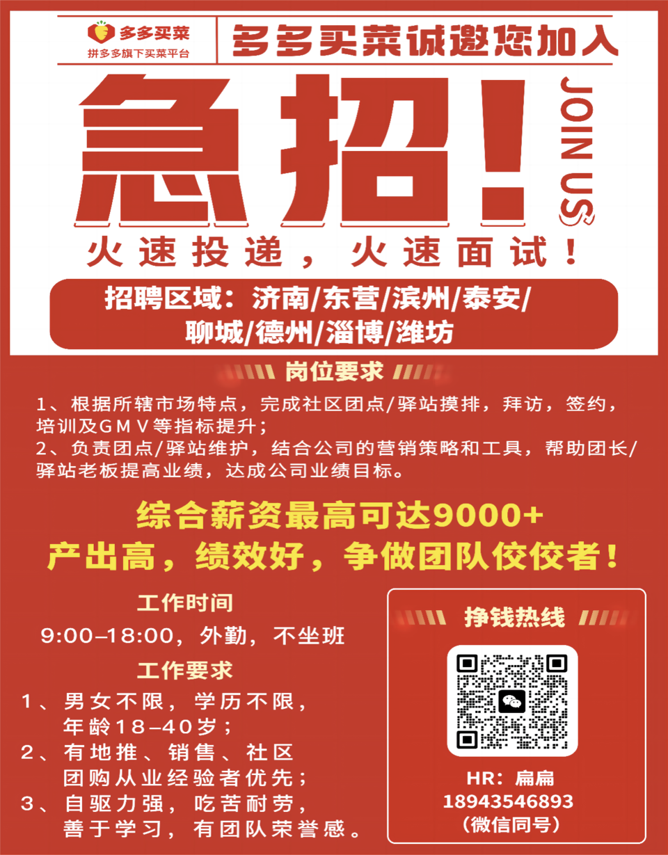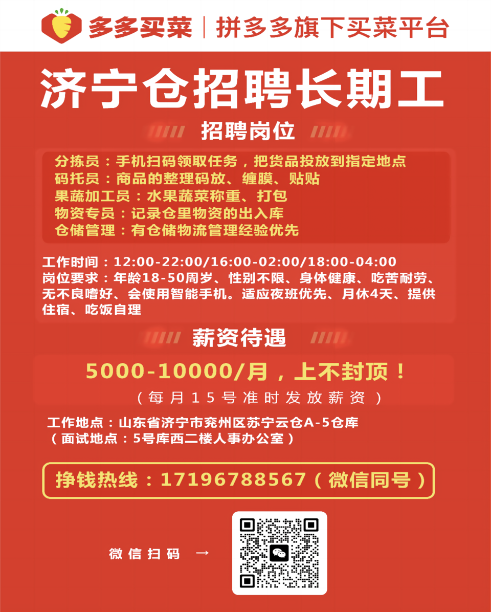 民以食为天。千门万户的一日三餐,与百姓民生紧密关联。为保障产运销等环节有序运转,做好市民粮食蔬菜供应,多多买菜济南仓、齐河仓、济宁仓及周边地区现需分拣员、码托员、果蔬加工员、仓储管理员、销售BD等数名。公司提供极具竞争力的薪资,部分岗位计件月薪突破万元,还有住宿等福利。大平台有保障,薪资不拖欠、工作氛围佳。