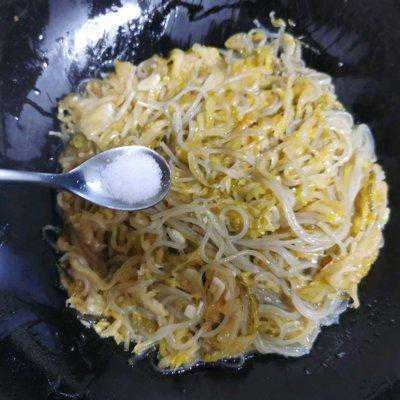 7、粉条捞出来入锅,少带点水分不粘锅,然后加一汤匙生抽调味