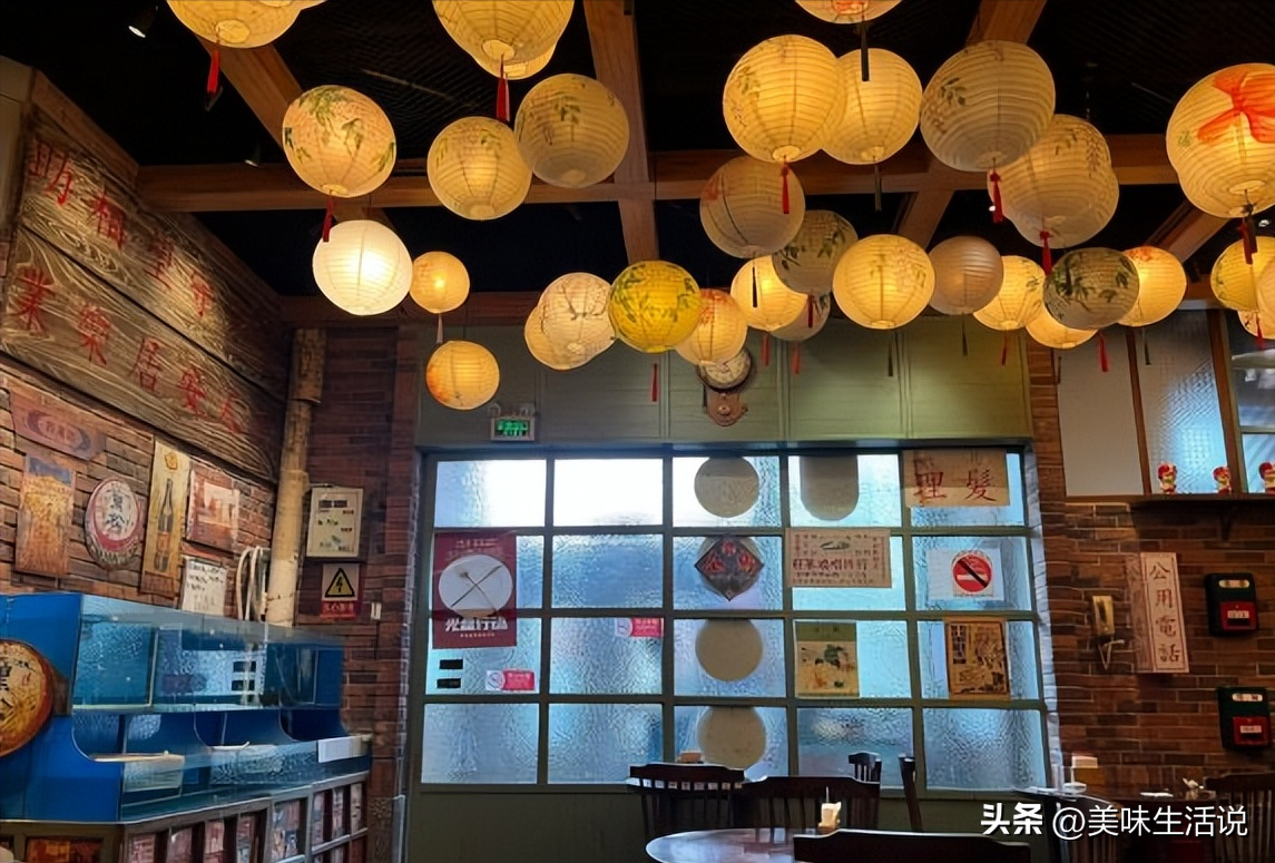 走进店内,有种梦回八九十年代的感觉。天花板上挂满了圆圆的纸灯笼,很漂亮。老式的木门窗、红砖墙、旧海报、招牌、年画、旧家具,把复古氛围感拉满。