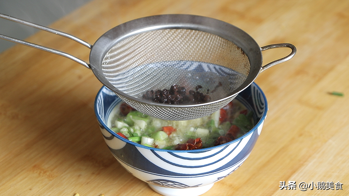 2、锅里倒入适量食用油,放入一小撮花椒炸出香味。再把花椒过滤出,热油倒在辣椒蒜葱花上,等1分钟,让香味充分激发出来。