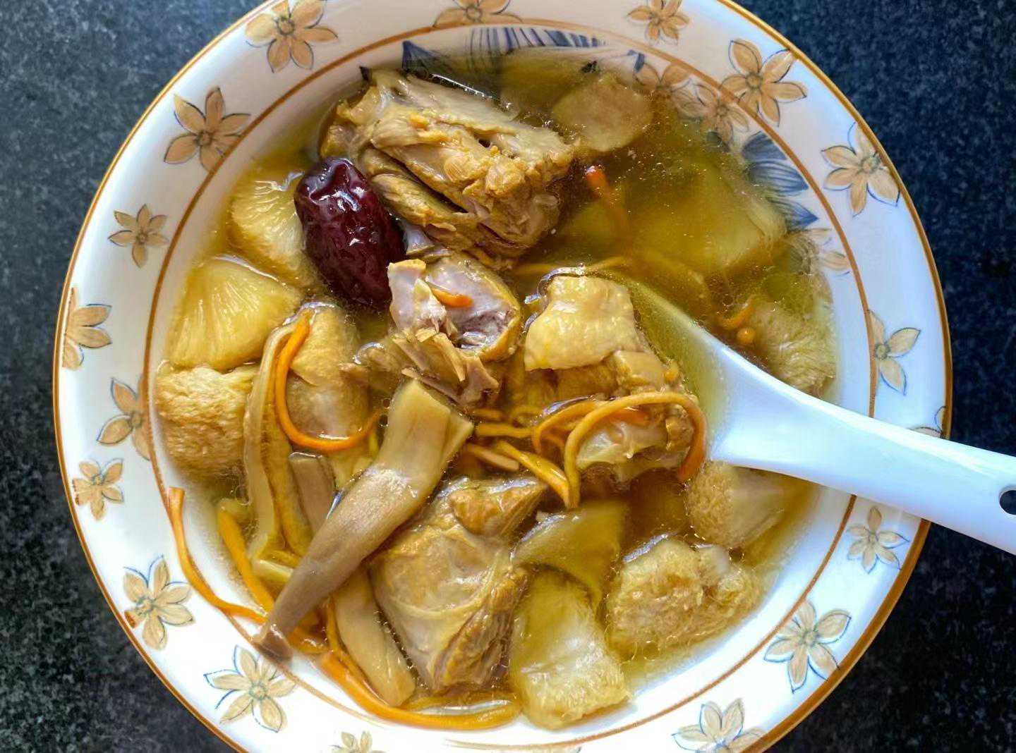 食材:鸭肉,猴头菇,鹿茸菇,红枣,生姜,虫草花(儿童,孕妇,真菌过敏者不宜食用)