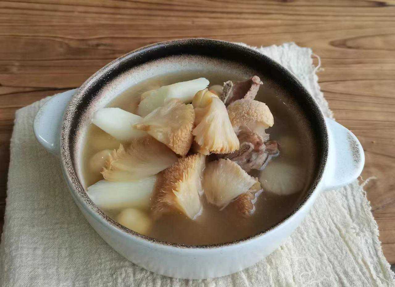 食材:猴头菇一朵、猪骨300克、莲子10克、山药10克、芡实10克、茯苓10克