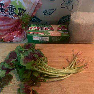 1、准备食材:我用了广式腊肠和苋菜,可换成其它青菜或胡萝卜等