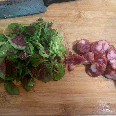 3、同时将腊肠切片,青菜洗净切小段