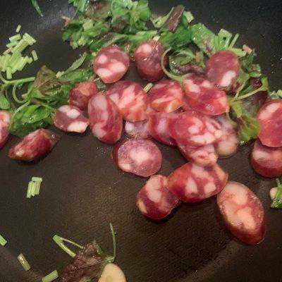 6、加入腊肠继续翻炒
