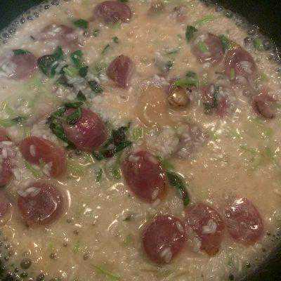 小贴士猪骨汤可以自己熬,不过我赶时间就用浓汤宝啦;腊肠是关键,青菜可换其它蔬菜如胡萝卜、土豆等;水不要太多像平时煮饭一样不然就成粥啦