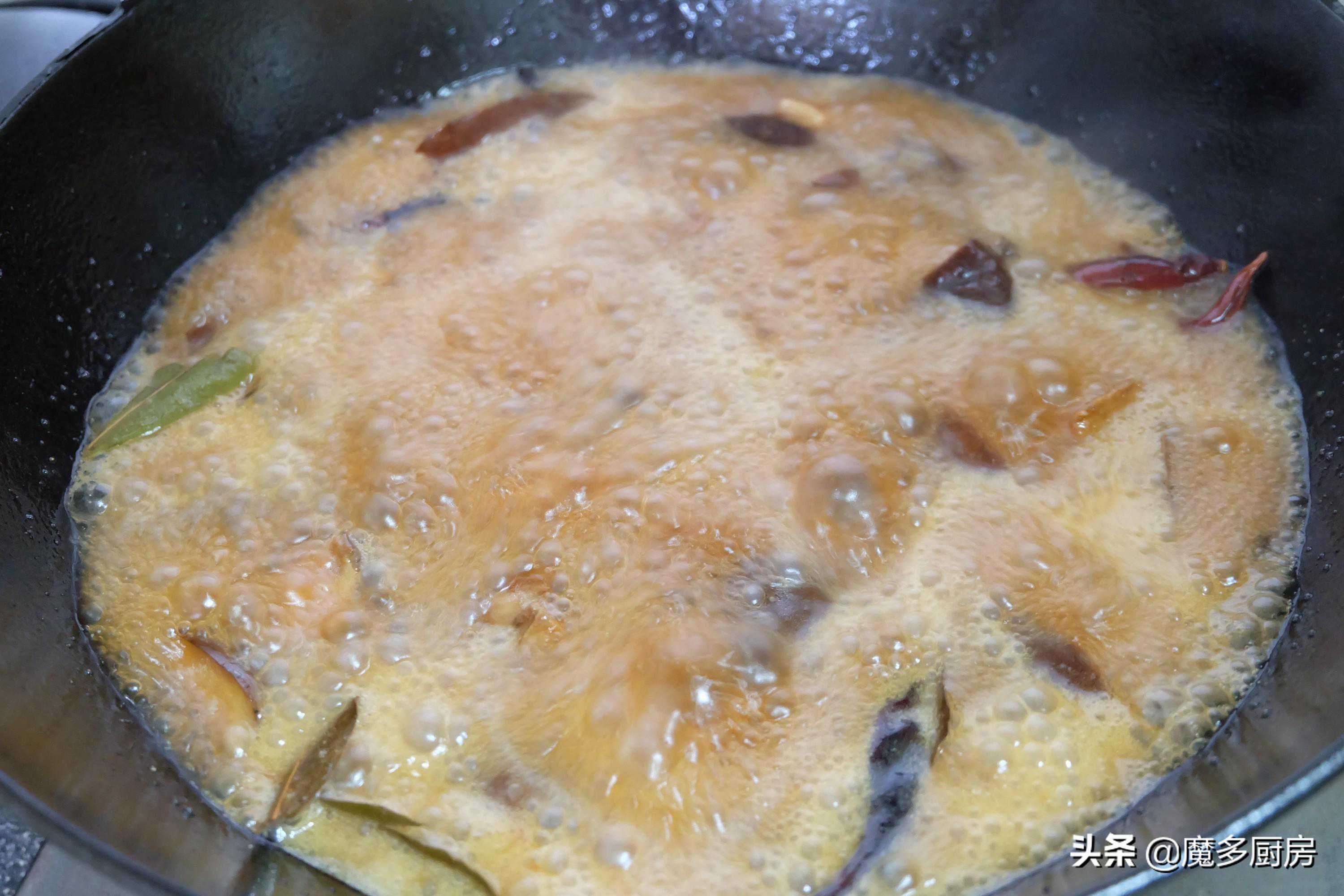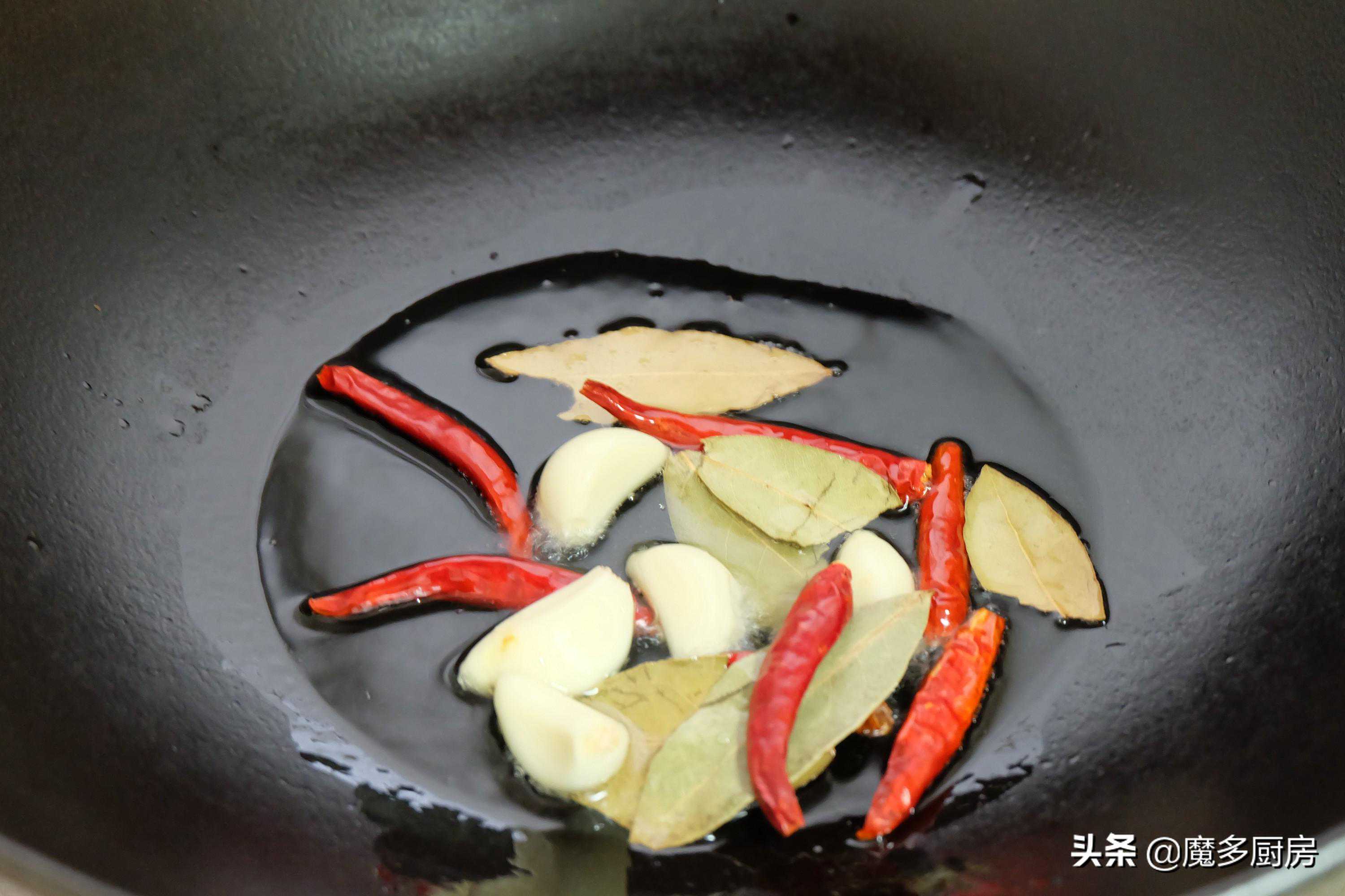 5、铁炒锅上火烧热,放食用油,把大蒜、香叶、干红辣椒放进去;