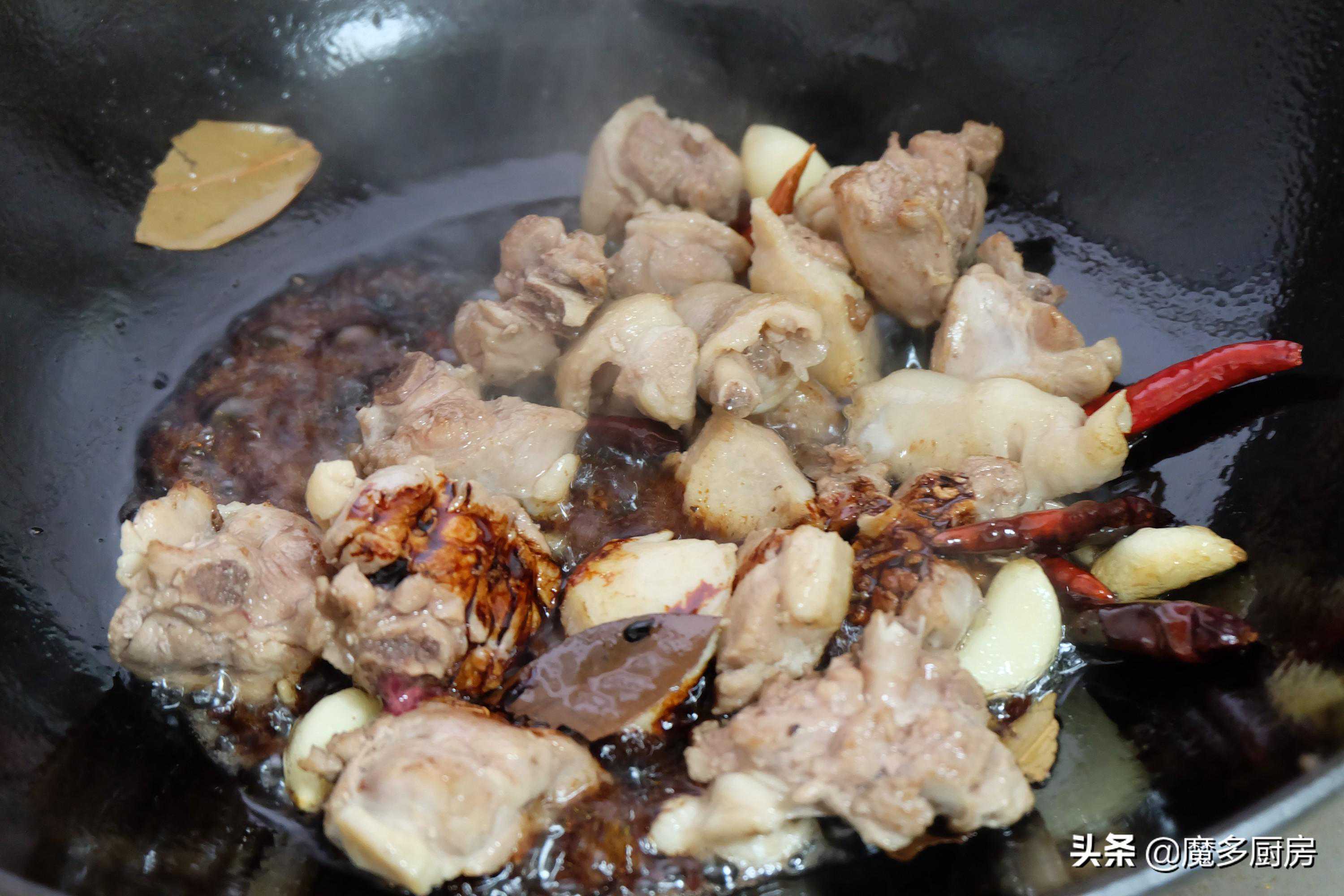 7、倒入一勺冰糖老抽酱油,酱油可以使鸭肉块颜色红润入味,更加有食欲,小火翻炒至鸭腿肉上色;