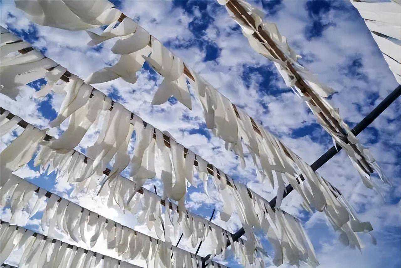 冬瓜干的制作方法也很简单,冬瓜去皮、去瓤后用刨刀刨成约8厘米宽不足1厘米厚的瓜条用竹竿架起排列整齐的瓜条挂晒在阳光下暴晒一两天即可晒成干。由于晾晒时间短冬瓜内的风味物质保留完好。