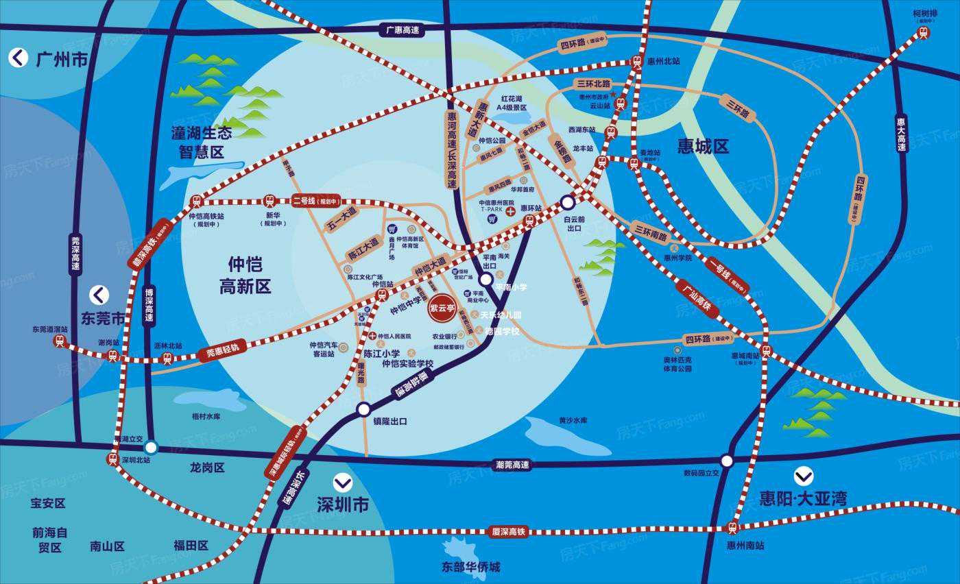 高速交通,项目距平南高速路口仅500m。学校:仲恺中学、新春小学、陈江小学、平南小学、惠州市德园学校,商场:欢乐海湾购物中心、天益城购物中心及T-park时尚公园城市商业综合体,另外还有平南市场、人人乐等医院:仲恺人民医院、第四人民医院、中信医院、惠环医院等银行:中国银行、工商银行、建设银行、平安银行、广发银行等其他:陈江街道办事处、地税局、车管所。