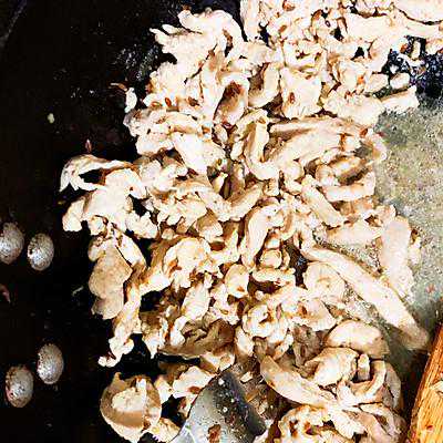 5、鸡丝炒熟,加少量料酒去腥,出锅前加盐和孜然