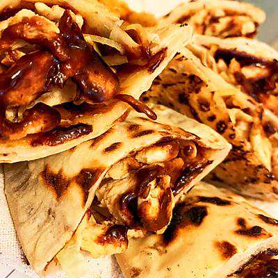 7、烙好的饼中间切开,甜面酱抹匀,放入黄瓜丝,土豆丝和鸡丝