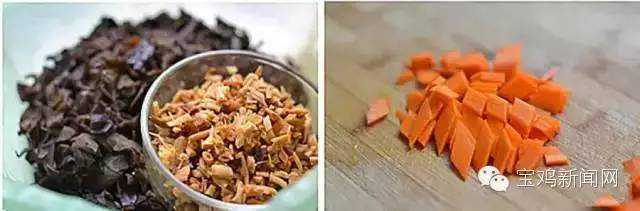 胡萝卜切菱形小薄片或者细小丁;水发黄花菜和黑木耳切末