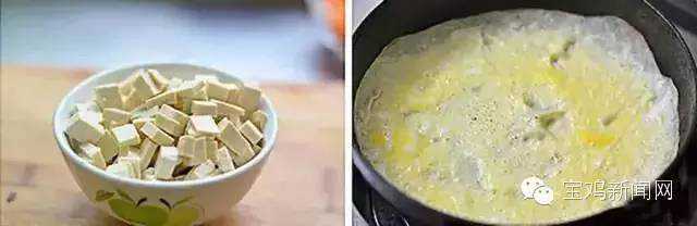 豆腐切丁,用炸过的豆腐比较好,炒的时候不会粘锅;鸡蛋摊成蛋皮