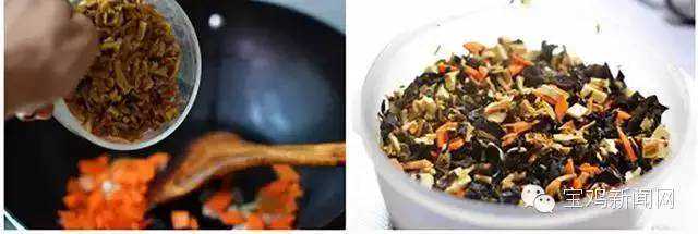 锅中放少许植物油,依次下入胡萝卜、豆腐、黄花菜、黑木耳炒至成熟加食盐和鸡精;盛出备用,素臊子制作完成