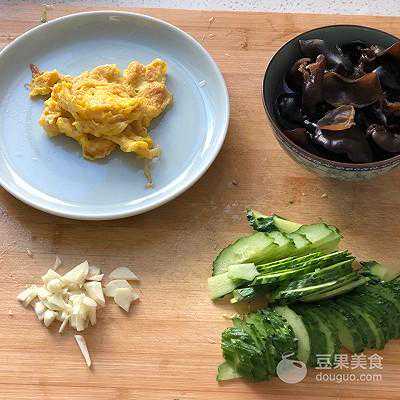 4、木耳去蒂洗净,一人食分量一个小碗刚好,黄瓜(比较长的话,半根也就够了)切薄片,蒜切蓉。