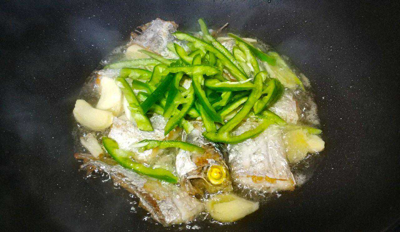 4、直到刀鱼段的两面都被煎炸至色泽焦黄,外皮微脆,肉质充分熟透,向锅中加入之前切好的大蒜片、生姜片和青辣椒丝,慢慢翻炒均匀。