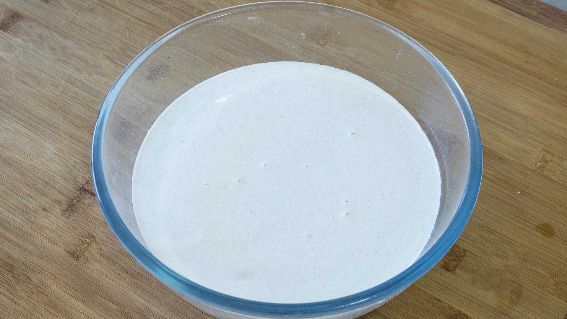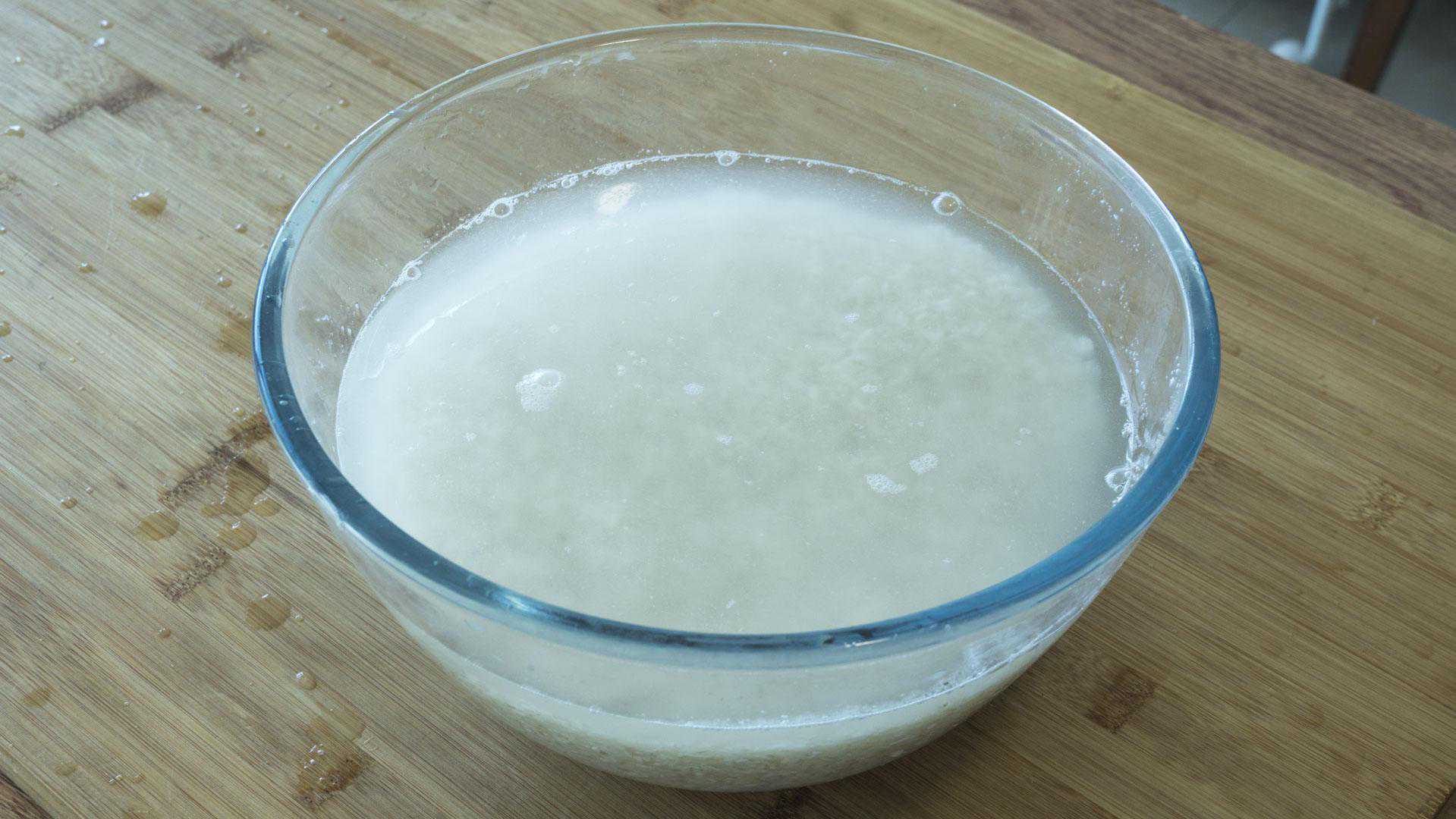 2、米浆发酵完成之后翻拌排气,这样可以去掉米浆里面大团大团的气泡,不然的话太多的气体会让蒸出来的米发糕内部充满了巨大的孔洞;