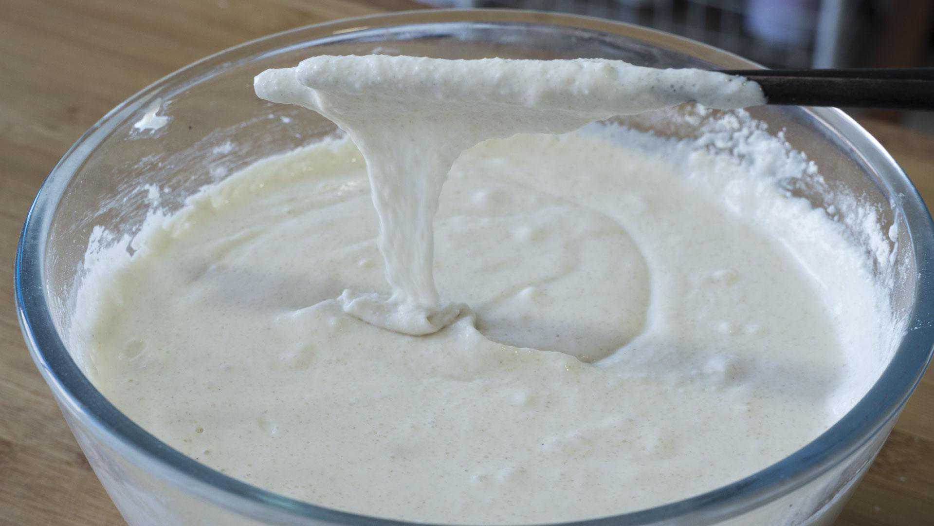 4、因为面粉的吸水性不同,如果搅拌好的面糊太干就加点温水,太稀就适量的加点面粉,搅拌好的面糊状态是细腻可流动的,滴落的时候可以看到痕迹但会快速消失,像这种程度就可以了;