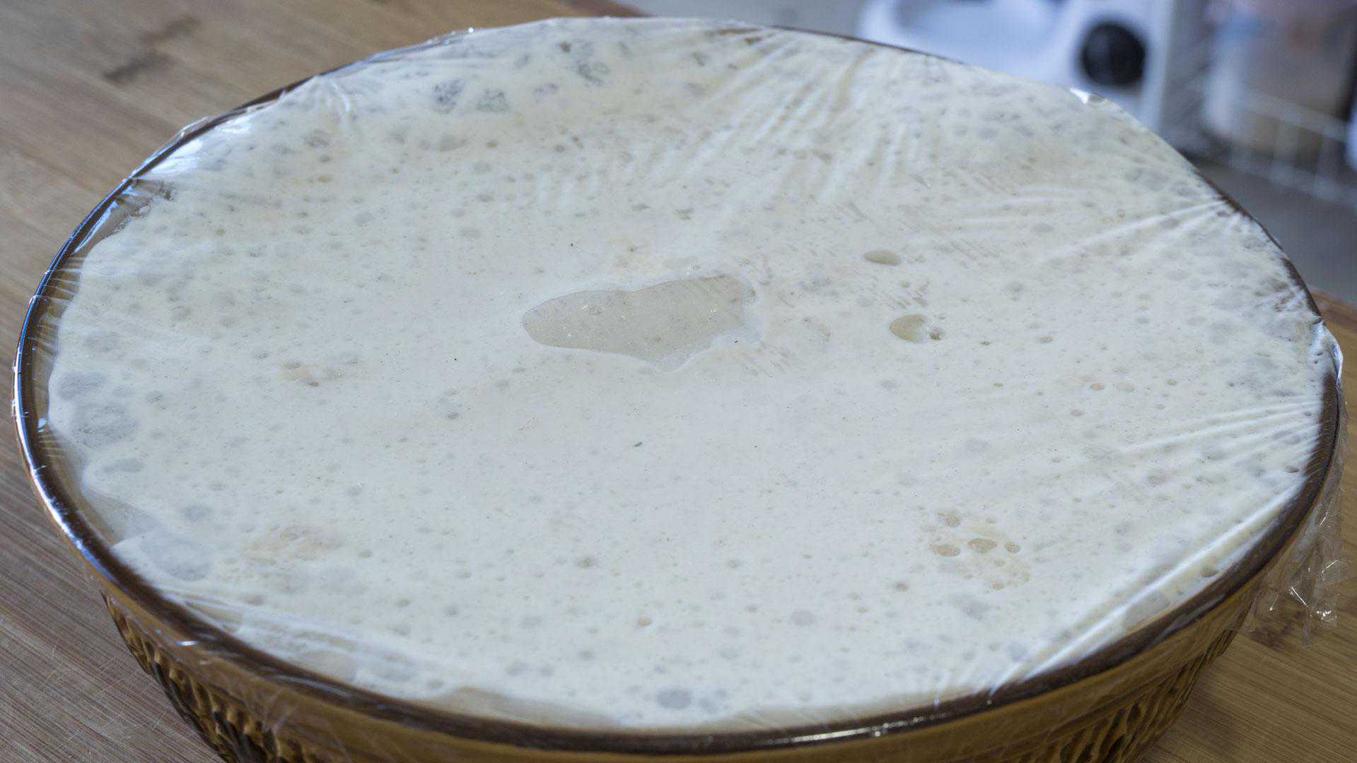5、这个玻璃碗有点小,我换了一个大一点的碗,然后盖上保鲜膜后放到温暖的地方发酵至原先体积的两倍大;