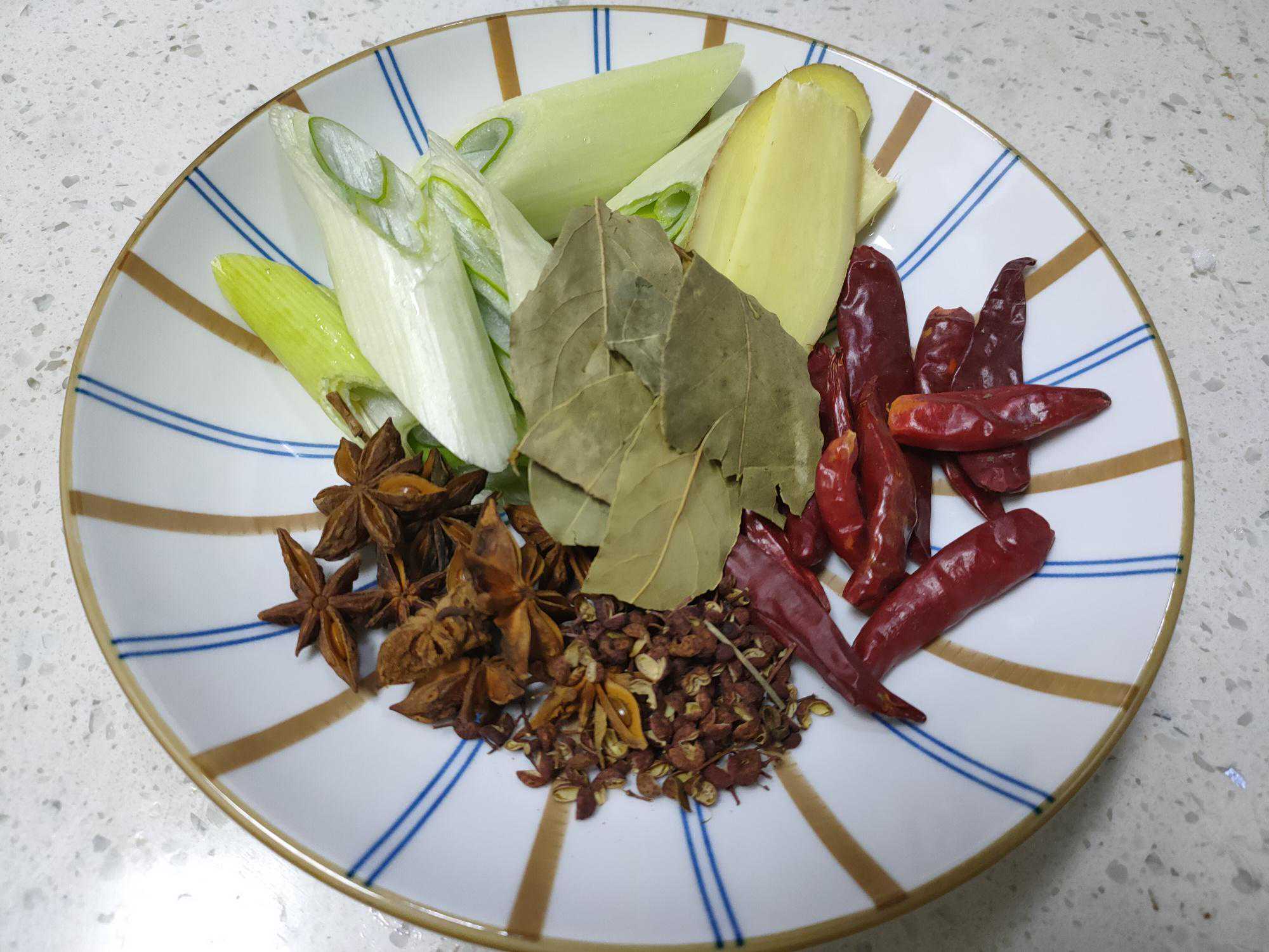 准备食材:琵琶腿1000克、大葱一根、生姜一块、干辣椒5克、花椒3克、八角3克、香叶2克、甜面酱两茶勺、盐适量、生抽适量、老抽适量、鸡精适量。