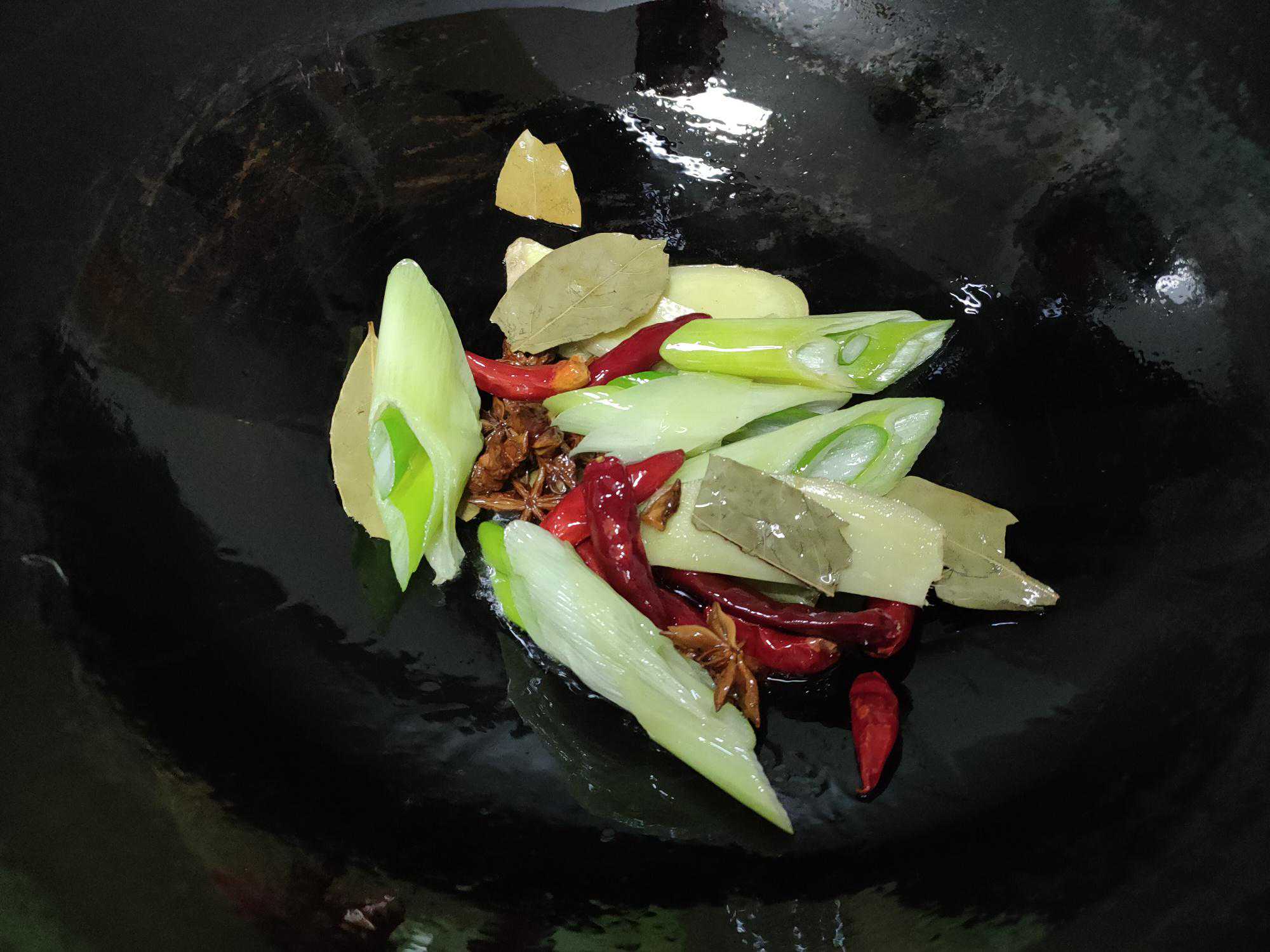5、锅里加入适量食用油,油热后把葱段和姜片下入锅中,煸炒出香味后加入剩余的其他香料,煸炒出香料的香味。在卤鸡腿的时候,提前把香料煸炒一下,香料的渗透能力会更强,鸡腿更容易入味。