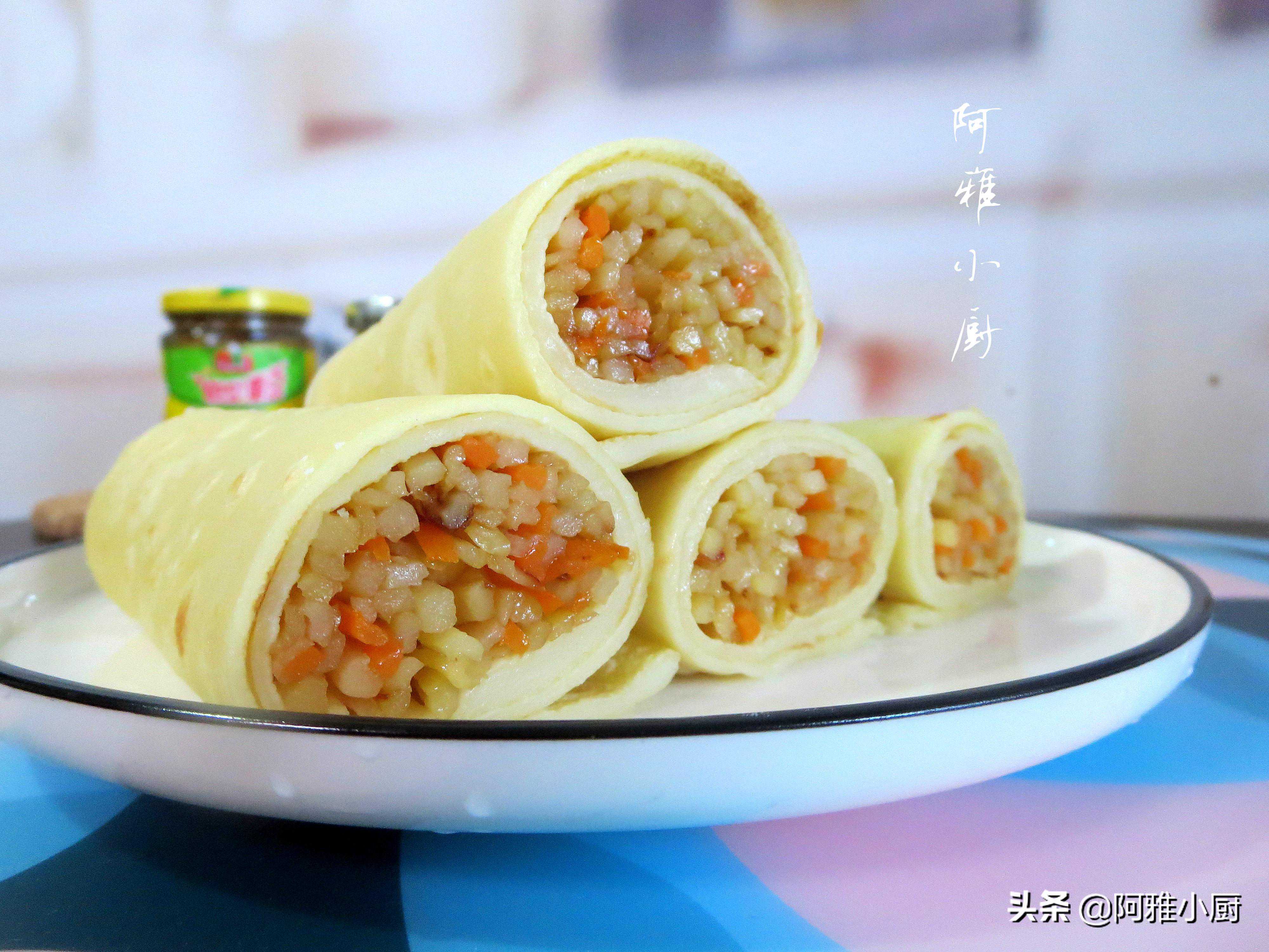 4.把炒好的土豆丝摆在薄饼的一头,卷起来就可以吃了;