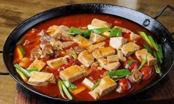 4.临走菜时,先往净锅里舀入豆腐(带汤),放入牛腩块和蒜苗节略煮后,调入鸡精、味精并淋入藤椒油和香油,起锅盛入烧烫的铁锅内,即成。