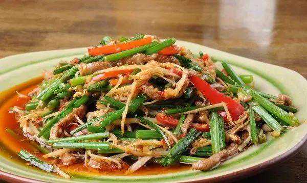 3.净锅放少许色拉油烧热,下郫县豆瓣酱、干青花椒、泡椒末、姜米、蒜米和小米椒圈炒香后,把鹅丝、韭菜节和子姜丝下锅翻炒匀,其间调入盐、鸡精、味精、辣鲜露和藤椒油,勾芡后起锅装盘。